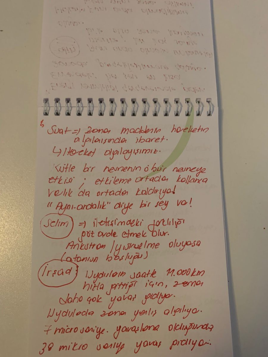 Murat: Işık dalgalanmasa zaman da durur. Ölçüm olmazsa zaman da yok. Nesnelerin hareketi, değişiminde zaman mefhumu yok. Atan saatlerinde zamanı ölçüyoruz; 9 milyar titreşim 1 saniyeye denk geliyor. Kütle zamanı yavaşlatıyor. Bir nano saniyede boşluk olursa algılayamayız.