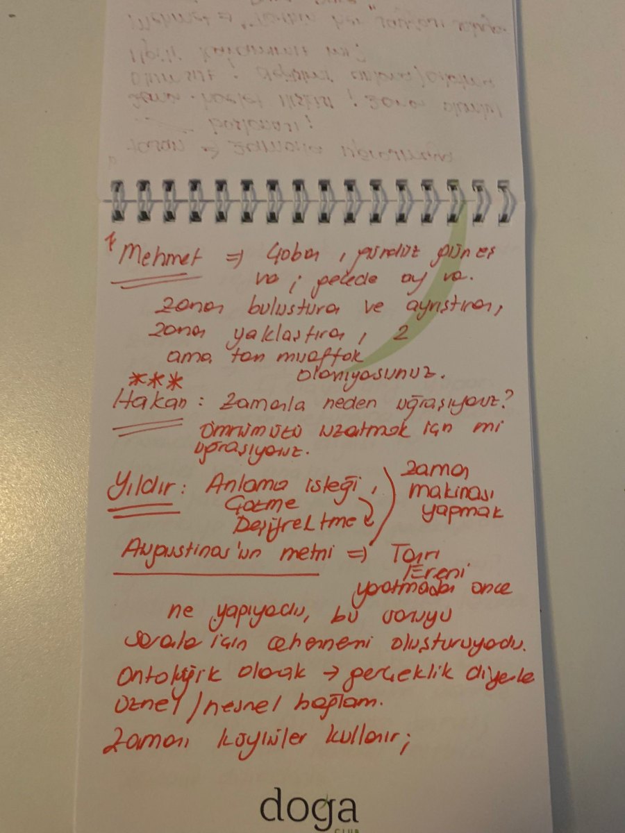 Geçmiş yok artık, gelecek gelmedi, şimdi de referansızdır. Gerçek zaman tanrı katındaki zaman. Köylüler mevsim döngülerine atıf yapar. İnsanın zaman mefhumuna ihtiyacı var. İnsanda değişim algısı var. Hareket var. Analiz için bu kavram gerekli. Kant’taki anlamıyla zaman görüşü gerekiyor. Önce-sonrası gerekiyordu.