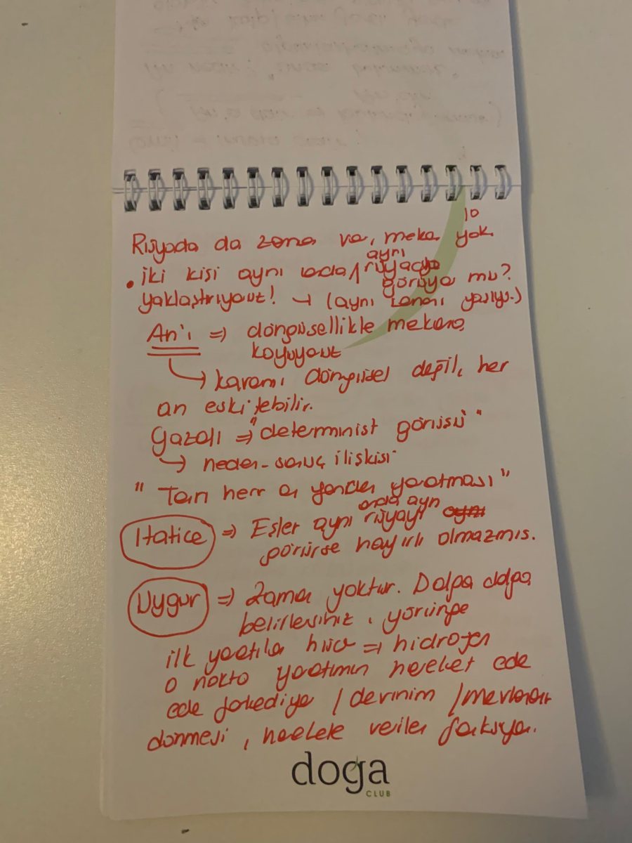 Çağatay: Aziz Augustinus, zaman nedir diyene kadar biliyordum, der. Bir fonksiyon gibi düşünürsek değişkenlerini konuşmak lazım. Mekânla birleştirerek konuşuyoruz. 2 boyutta mekân olunca zaman yok. Zaman, aynı mekânı kullanıyorsak aynı zaman. Yeni mekân kullanıyorsak zamanı taşıyoruz. Rüyada da zaman var, mekân yok. İki kişi aynı anda aynı rüyada görüyor mu? Yaklaştırıyoruz. Ânı döngüsellikle mekâna koyuyoruz. Kavram döngüsel değil, her an eskitebilir. Gazali, determinist görüşü, neden – sonuç ilişkisi içinden bakıyor. Tanrı her an her yönden yaratması gerekiyor.